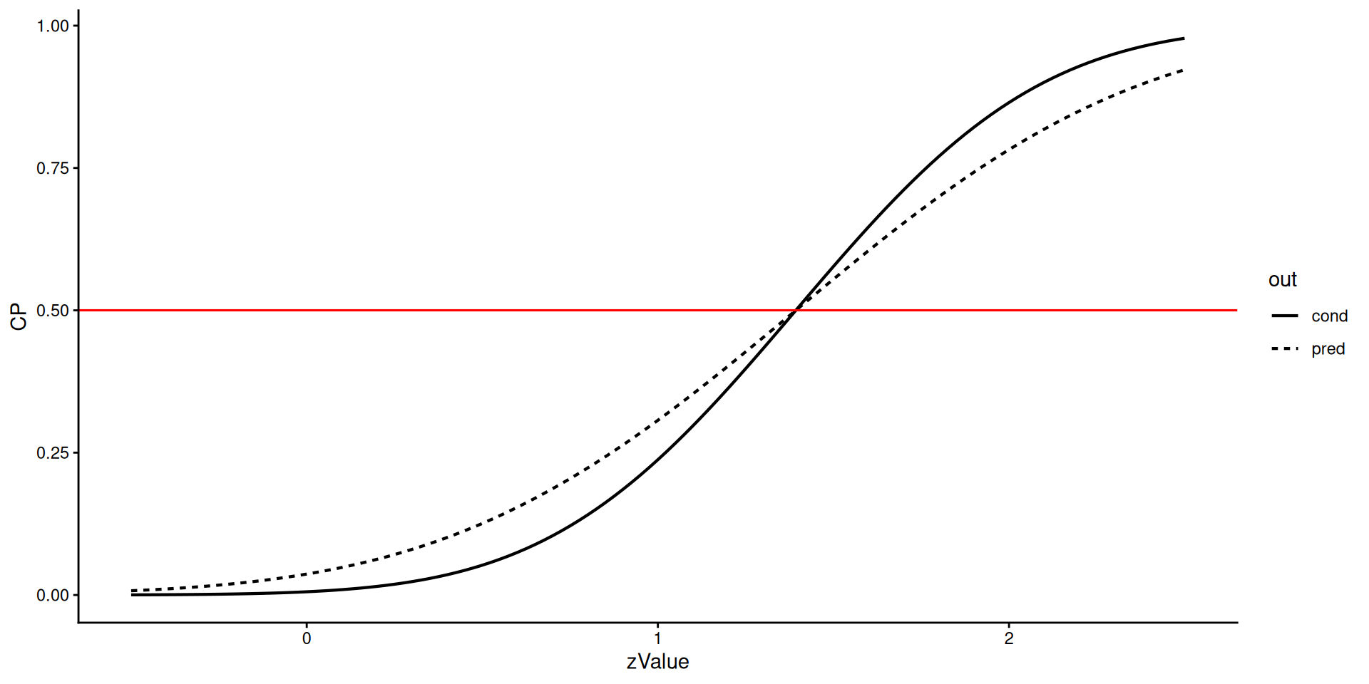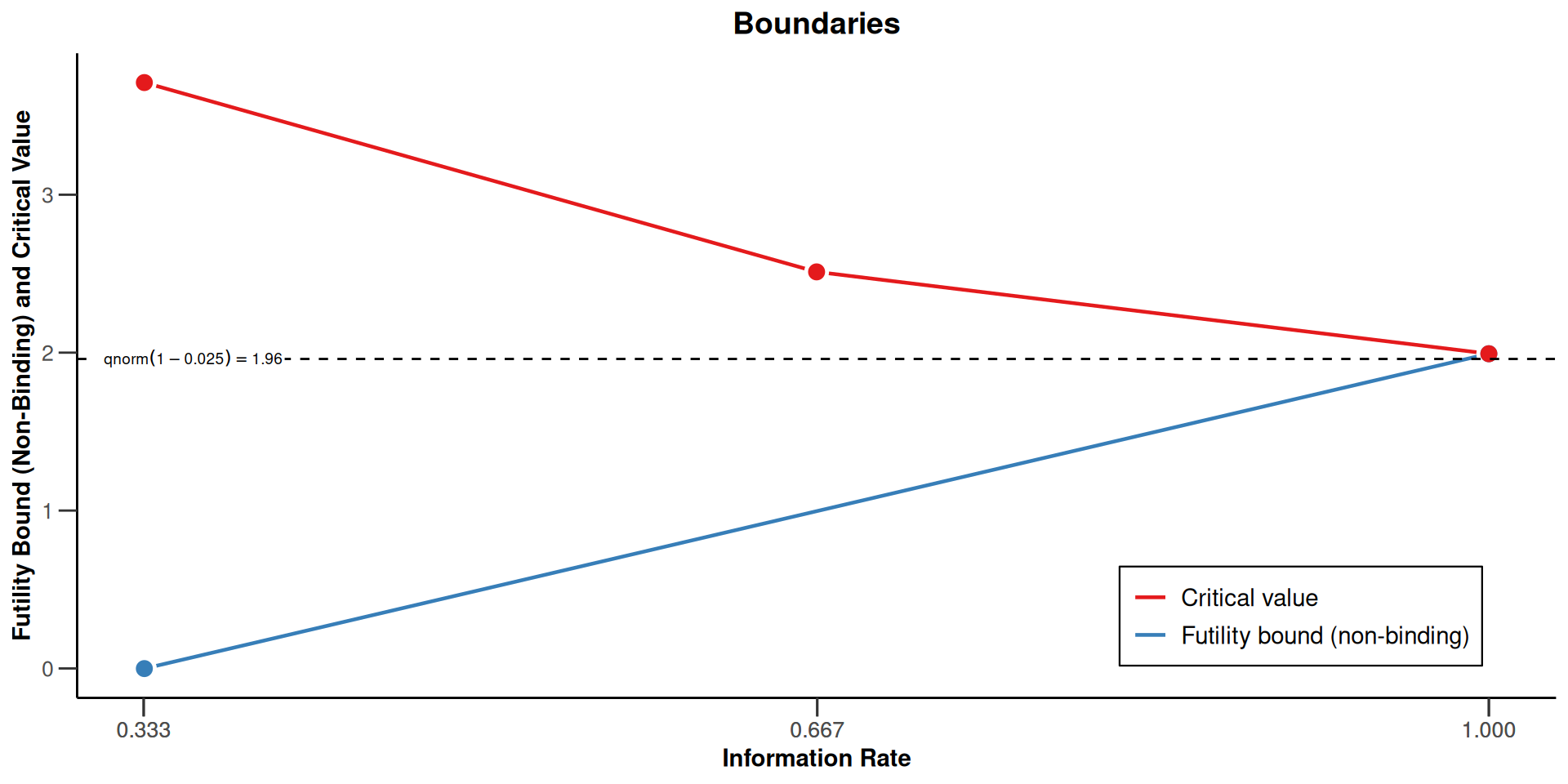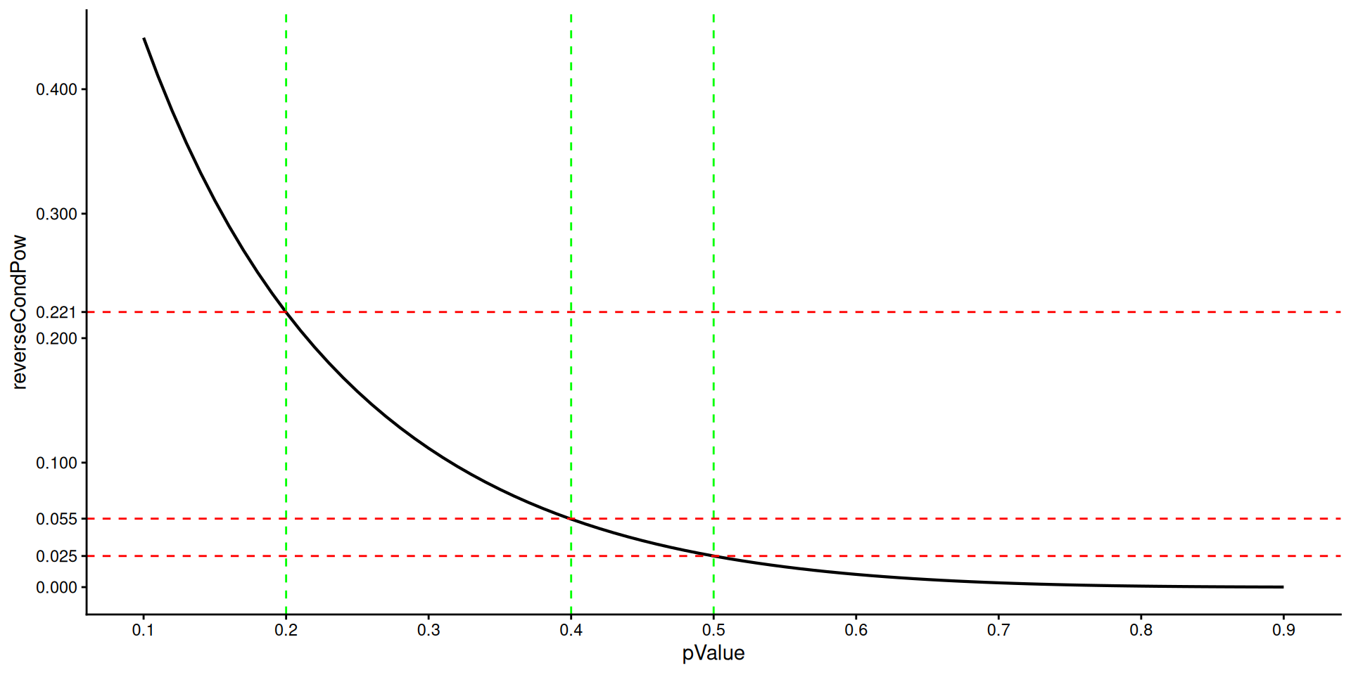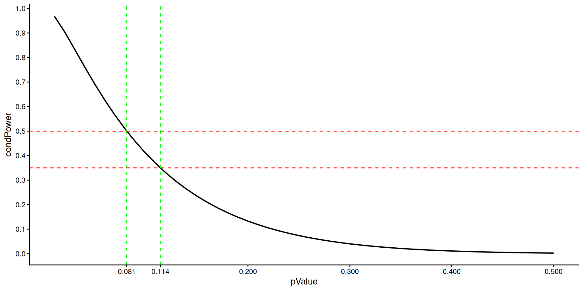 One attractive choice is stopping for futility if RCP \(\leq 0.025\) (\(\widehat = \;\; z \leq 0\) for two-stage design at level \(\alpha = 0.025\) with no early stopping)