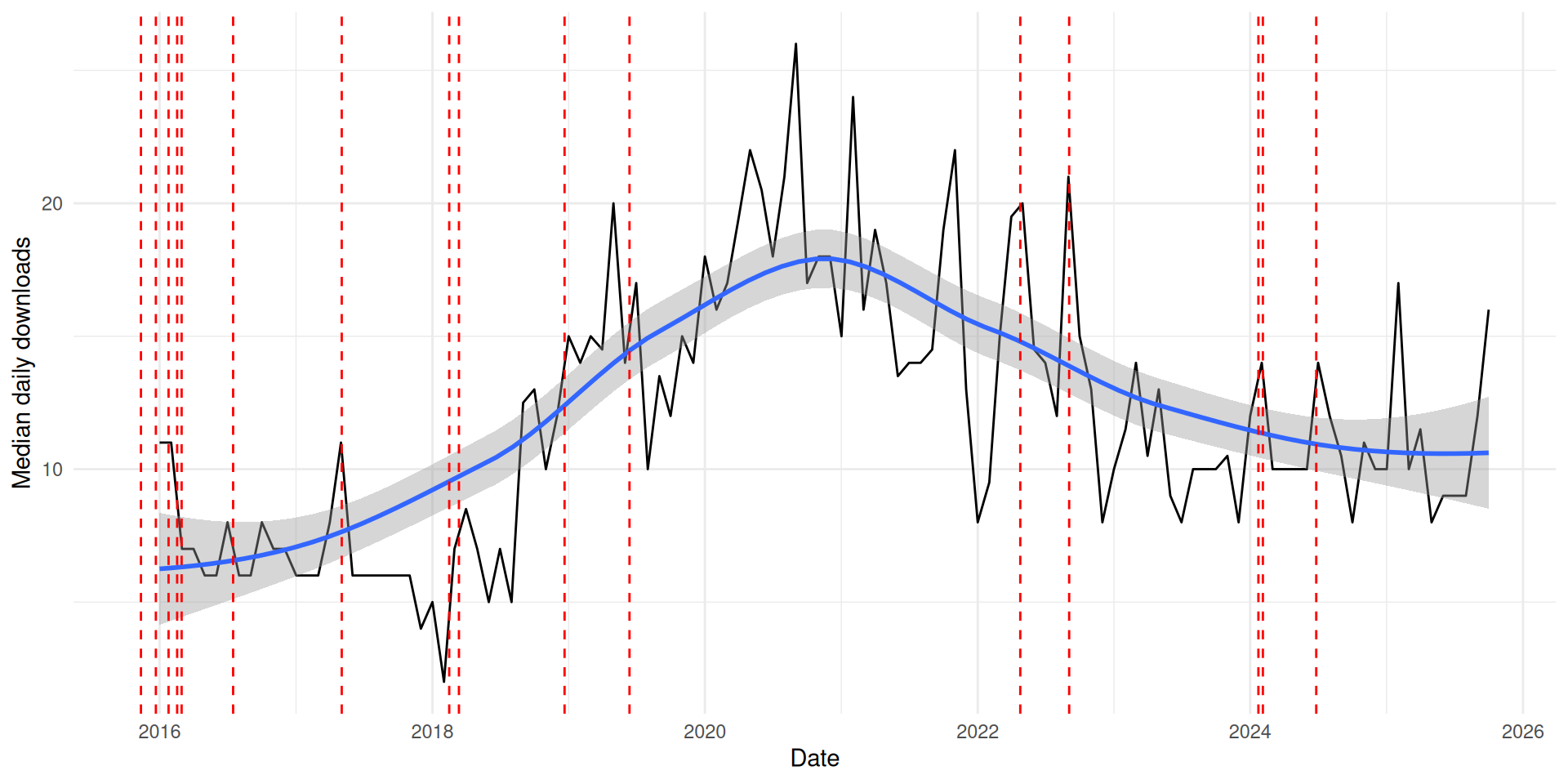 Median daily downloads of crmPack from CRAN each month since 2016 (new CRAN versions marked by red lines, last new features on CRAN before 2020)
